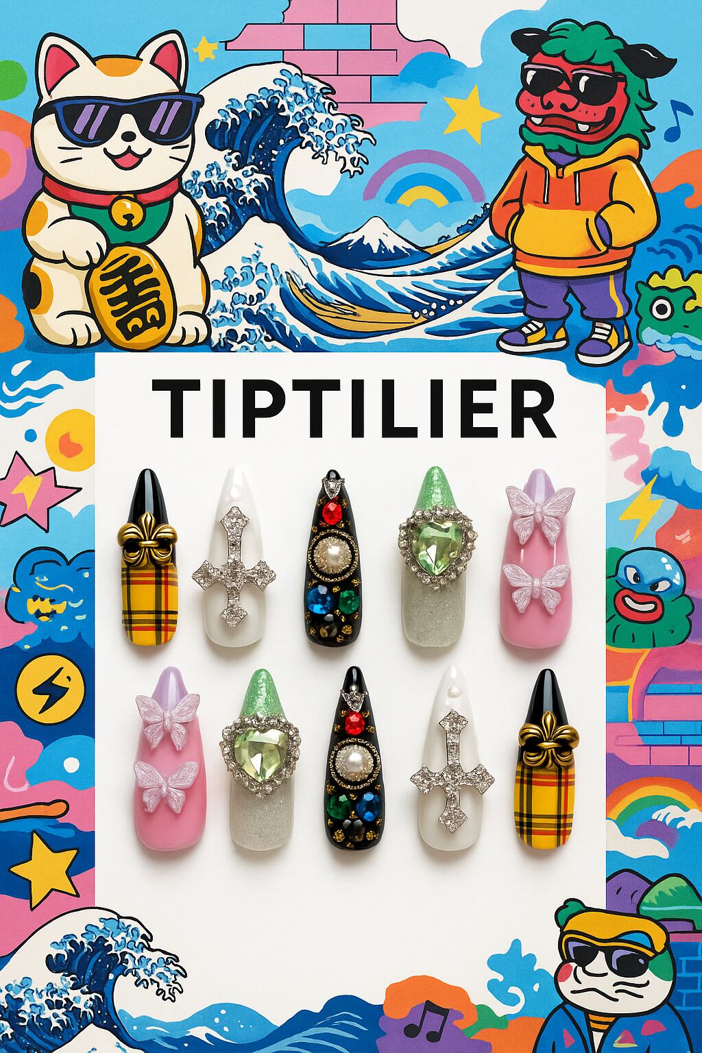 原宿ポップと日本の伝統美を融合した、Tiptilierの個性爆発ネイルチップ。日常の中にアートを取り入れたいあなたへ。時間をかけて丁寧に仕上げた一点ものをお届けします。